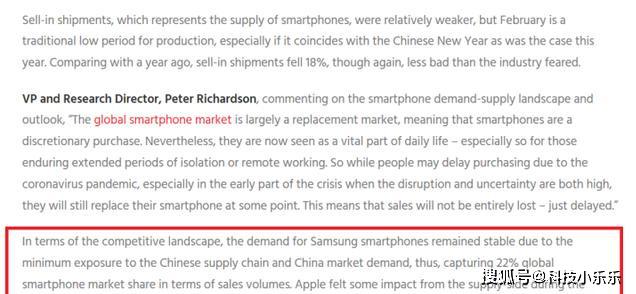 就市场竞争格局而言,由于中国供应链以及中国市场的需求对三星的影响最低,因此三星智能手机保持稳定,在销量方面占据了全球智能手机市场份额的22%。苹果在2020年的2月初在中国以及下半月在中国以外的供应方面都受到了一些影响,从而影响了其销售业绩。至于华为,从供求角度看,在中国的业务覆盖面最大。实际上,华为的表现远好于预期,2月份智能手机销量超过1200万部,全球市场份额仅下降了1%。