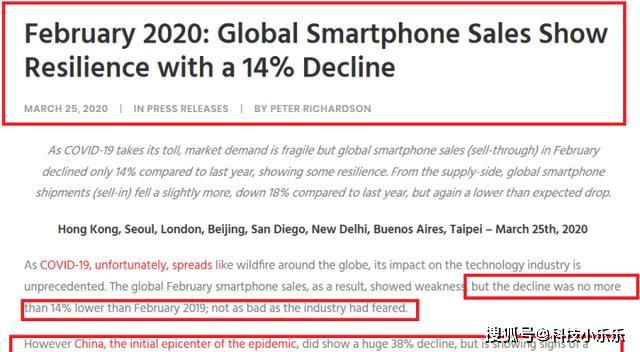 报告中显示:由于COVID-19像野火一样在全球蔓延,它对技术行业的影响是空前的。结果,2月全球智能手机销售表现疲软,但降幅比2019年2月低不超过14%; 不像业界担心的那么糟糕。