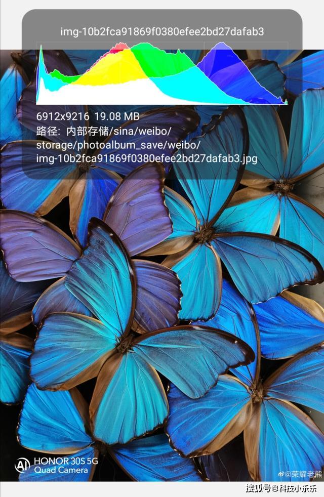 从样张中我们可以看到,蝴蝶的色彩还原非常准确,放大之后的细节部分也是十分清晰。不要忘了左下角的水印:Quad Camera明确的指出了荣耀30S 采用的是后置四摄的解决方案。查看原图的详细的信息,会有更多的发现。
