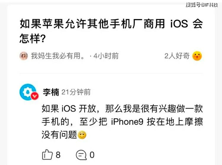 ios具有流畅稳定、几乎不杀后台、完善生态等特点,成为了苹果手机非常重要的核心技术优势,因此多年来也有很多网友疑惑如果ios可以给其它手机厂商使用,苹果手机还会有人买吗,相信很多人都认为如果其它手机也能使用ios,高价iPhone基本卖不出去了。而魅族前副总裁李楠称说“如果IOS开放,那么我是很有兴趣做一款手机的,至少把iPhone9 按在地上摩擦是没有问题”。可见ios是被所有消费者公认的强大的手机操作系统。