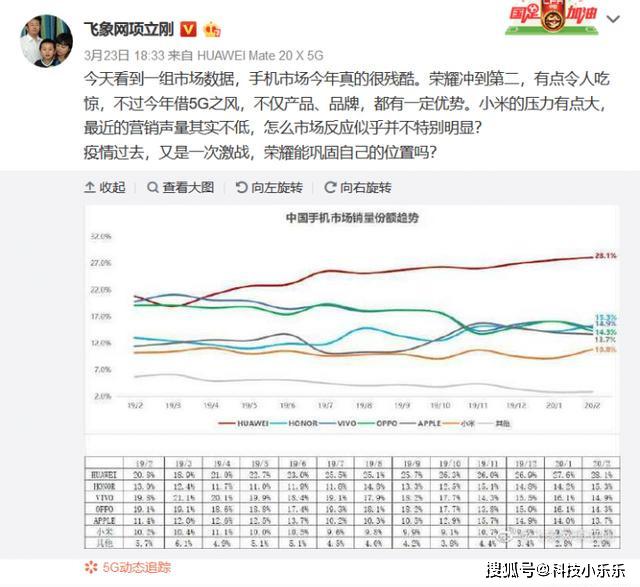 看完了华为,我们再来看一下华为的小弟——荣耀,从这份数据中我们可以看到荣耀在19年2月份到19年9月份的时候,一直都与苹果手机打得难舍难分(指国内市场份额),但是从19年10月份,荣耀在国内的市场份额出现了大幅度的增长,之后荣耀在国内手机市场的市场份额便开始波动,与苹果OV打得难解难分,在今年2月份的时候,荣耀以微弱的优势胜过苹果和OV,冲到了国内第二的位置。
