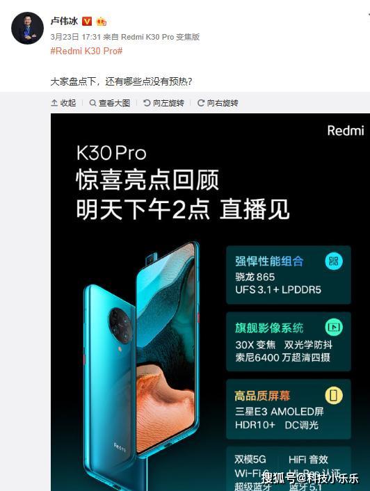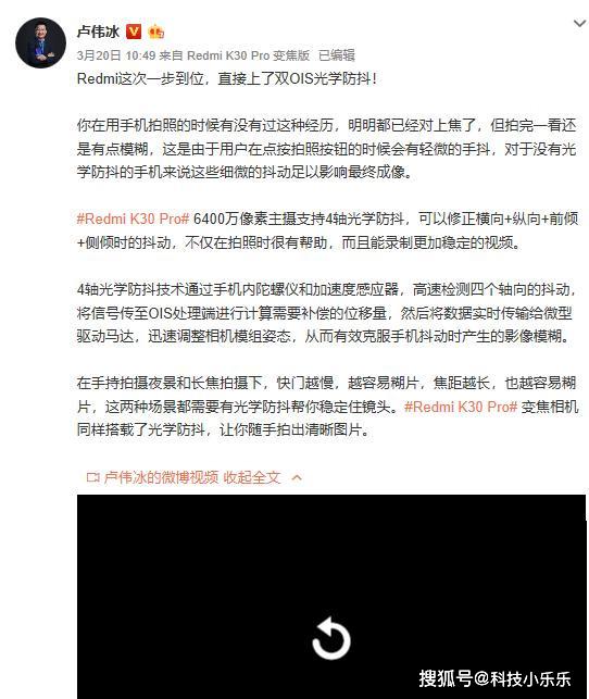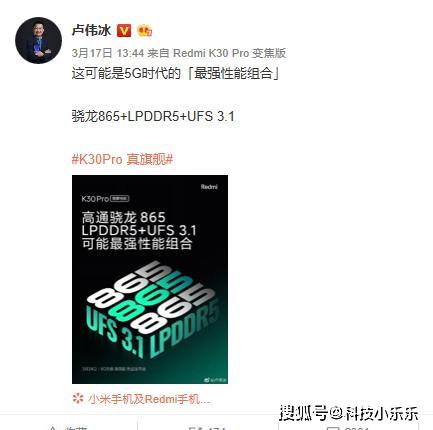 先说虚假宣传。众所周知,小米的每款产品发布会之前小米都要进行少则半个月多则一个月的预热,K30Pro的发布也不例外。在小米10系列发布之后,小米的一众高管就开始忙着给K30Pro做宣传。并且主要宣传点是:高通骁龙865+LPDDR5+UFS3.1以及双OIS光学防抖。