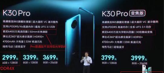 可实际结果是什么呢?宣传的标配LPDDR5+UFS3.1,6+128G的机型没有,只配备LPDDR4X+UFS3.0!宣传的标配双OIS光学防抖只有K30Pro变焦版才有,标准版没有!宣传的30倍变焦,仍然是只有K30Pro变焦版才有,标准版改配了长焦微距!而且这些差异,整场发布会卢伟冰只提了一个标准版改配长焦微距,其他的一概不提。只在屏幕下方很小很模糊的一行字,看着像:“6+128G的机型配备LPDDR4X+UFS3.0”。