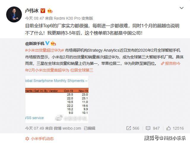 对于这样的好消息,身为小米副总裁的卢伟冰自然是不可能错过的,所以@新浪手机 的这条微博刚刚发布出去没多长时间,卢伟冰就转发了这一条微博,还趁机发表了一番感慨,卢伟冰的这番感慨在小编看来算是卢伟冰加入小米之后少有的几次比较让人人讨喜的话了,不过对于@新浪手机 所公布的这条消息却是不太相信的,后来觉得可能是因为华为受到疫情和谷歌断供的影响而销量大减,小米趁机超越了华为。