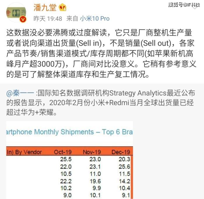 这份手机出货量数据公布后,卢伟冰等高管进行转发庆祝,不过潘九堂称这数据没必要沸腾或过度解读,它只是厂商整机生产量或者说向渠道出货量(Sell in),不是销量(Sell out),各家产品节奏/销售渠道模式/库存周期都不同(如苹果新机高峰月产超3000万),厂商间对比没意义。它稍有参考意义的是可了解整体渠道库存和生产复工情况。