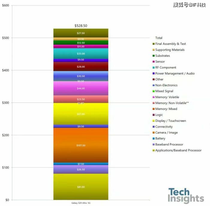 该调研机构列出的所有物料成本中,相机模组的成本是最高的,大约760元,原因是三星S20 Ultra配备一亿像素镜头+4800万像素镜头+1200万像素+ToF深感镜头,因此采购摄像头的成本已经很高,但三星还加入了100倍数码变焦和10倍光学变焦,相机成本几乎又翻了一倍。另外骁龙865+X55成本也很高,达到560元,屏幕成本大约490元。
