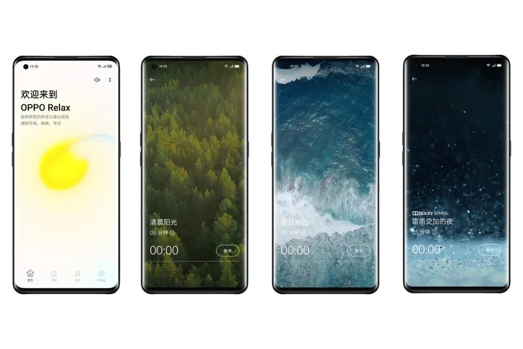 这里我们先聊OPPO Relax。它可以被理解成是一种“闲适的状态”。搭配 Find X2 Pro 内置杜比全景声音效,OPPO Relax 内置呼吸练习、背景纯音乐和环境白噪音用于辅助呼吸、睡眠、专注,提供舒适的声音让身心放松。