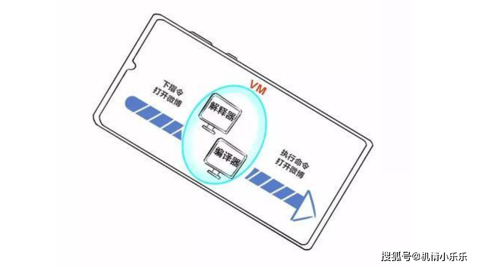 VM, 是运行安卓程序的一个虚拟计算机,它还带了2个翻译-解释器和编译器,当小伙伴打开微博过程中, 虚拟机开始运行,为了把高级语言转换成机器能懂的语言,虚拟机中有解释器和编译器,相当于两个翻译在运行; 解释器好像现场翻译,演讲者讲一句, 得停下来翻译一句给编译器 ,编译器则结合上下文一次翻译一大段