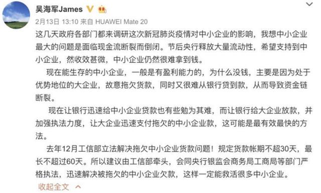 2月13日,许久都没更新微博的吴海军发布博文,提到了中小企业资金断裂的问题。“这几天政府各部门都来调研这次新冠肺炎疫情对中小企业的影响,我想中小企业最大的问题是面临现金流断裂而倒闭。节后央行释放大量流动性,希望支持到中小企业,然收效甚微,中小企业仍然很难拿到钱。”