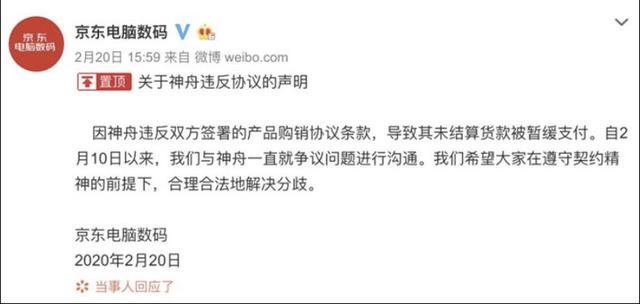 实际上,神舟与京东方面的返利纠纷,之前已有多次。而货款问题,之前虽有拖延,但从没像此次事件这么久。