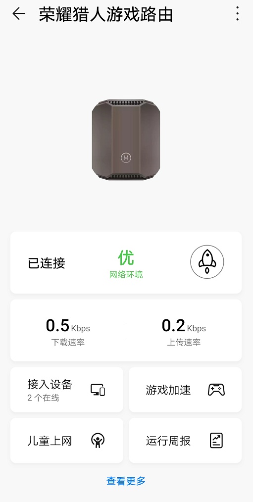 此外,这款App的首页不仅会显示路由器的工作状态,而且当前的网络环境、接入设备的数量等常用信息也能在首页上轻松查看。作为一款为游戏玩家打造的高端电竞路由,“游戏加速”功能也设计在了这款App的首页。