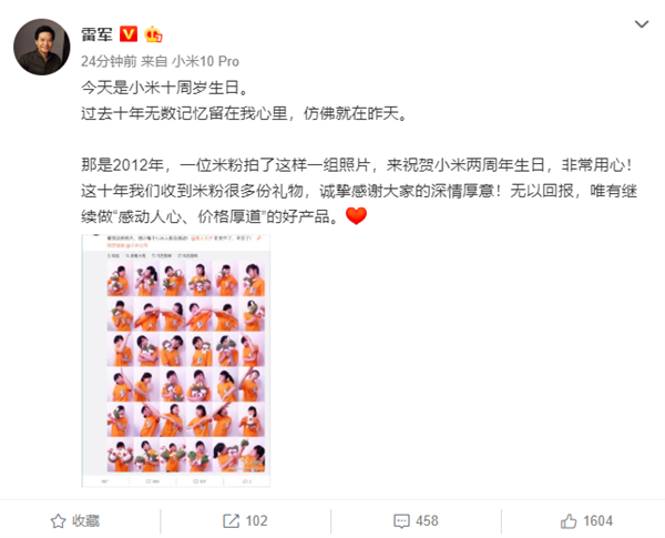 就在今天早上,雷军发微博称:“今天是小米十周岁生日。过去十年无数记忆留在我心里,仿佛就在昨天。”并晒出一组2012年米粉拍摄的创意比心照片,来祝贺小米两周年生日。同时表示,这十年我们收到米粉很多份礼物,诚挚感谢大家的深情厚意!无以回报,唯有继续做“感动人心、价格厚道”的好产品。