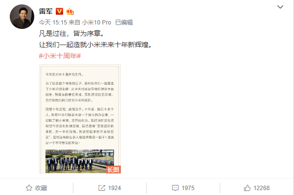 接着雷军又发博称:“凡是过往,皆为序章。让我们一起造就小米未来十年新辉煌。”并发长文称今天是小米十周岁的生日,为了纪念这个特殊的日子,我和伙伴们一起重走了小米的创业路:从中关村保福寺桥的银谷大厦起步,到望京的卷石天地,再到清河的五彩城,最后到我们自己建的小米科技园。最后雷军表示,创业是一条没有止境的道路,我们向着梦想的方向奔跑,未来的道路已在脚下,出发!小米加油!
