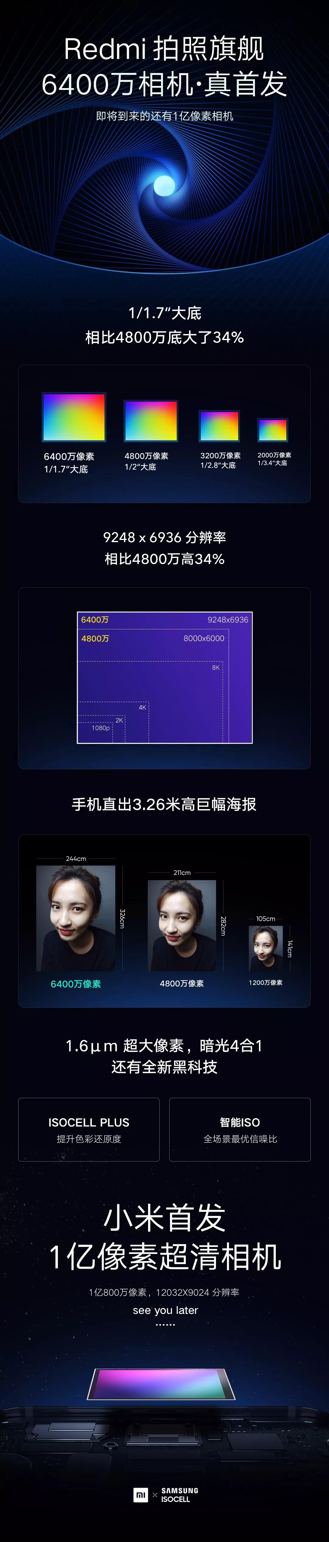 2019年8月7日,小米集团在北京召开未来影像技术沟通会,小米集团联合创始人,总裁林斌宣布小米集团旗下Redmi品牌将携手三星全球首发首款量产6400万超清相机手机,小米集团还将联合三星推出全球首款1亿像素超清相机手机。