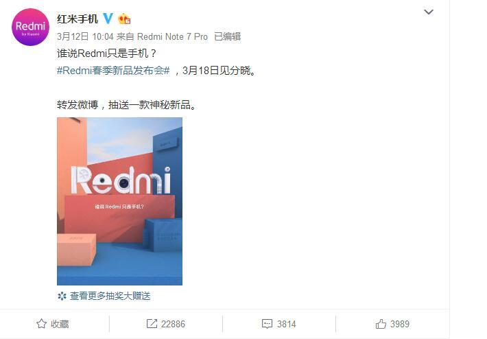 3月13日,小米官方微博宣布了,Redmi春季新品发布会将于3月18日正式召开,将会发布全新两款手机产品,分别为Redmi Note 7 Pro和Redmi 7。而除了手机产品,Redmi还会有一系列非手机产品正式登场。