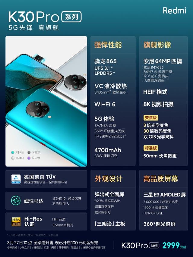 Redmi K30 Pro全系标配60Hz三星AMOLED屏幕,92.7%屏占比,无水滴无挖孔,支持0.58秒极速弹出前置相机,5种炫彩灯效,后置四摄居中设计,3D四曲面机身,拥有天际蓝、月幕白、太空灰与星环紫四色可选。配置上,采用骁龙865+LPDDR5+UFS 3.1方案,拥有3435mm²面积的VC散热板及线性马达,全系标配索尼IMX686/6400万超清主摄,Redmi K30 Pro变焦版支持双OIS光学防抖,支持3倍光学变焦+30倍数码变焦以及SAT(平滑变焦)技术,保留耳机孔并支持红外遥控,全系标配超级蓝牙+蓝牙5.1,搭配双模5G+Multilink三路并联 技术。同时支持连接2.4GHz Wi-Fi 、5GHz Wi-Fi和4G/5G移动网络。Redmi K30 Pro支持33W疾速闪充,搭载了4700mAh大电池。线性马达 + NFC + 3.5mm耳机孔 + 红外遥控 + 超薄屏下指纹。