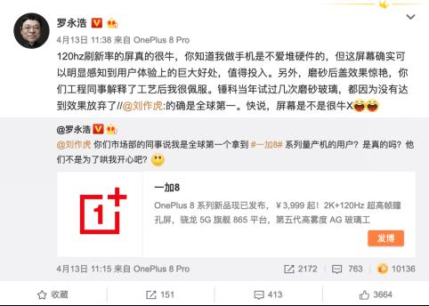 早在4月12日,有细心的网友注意到罗永浩发布微博的机型是“一加 8 Pro”,一下子就炸开了锅,大家纷纷猜测罗永浩和一加肯定在“密谋”什么。