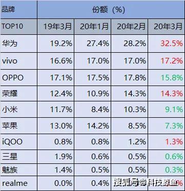 身为在逆境之中市场表现依然非常稳定的两个手机品牌,那么华为和vivo的销量表现究竟有多亮眼呢?从上面的手机品牌销量表中不难看出,虽然华为和vivo的手机销量都曾在2月份受到了严峻形势的冲击,但是凭借着出色的应对策略,华为与vivo均在3月份实现了强势反弹,相比去年的三月实现了同期增长。从下表中的数据来看,二者的市场占比分别达到了32.5%和17.2%,绝对是手机市场中的两股重要力量。