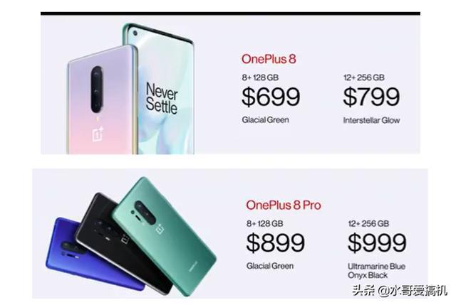 最后就是大家期待的价格了,一加8:8+128G版售价699$、12+256G版售价799$;一加8Pro:8+128G版售价899$,12+256G版售价999$。