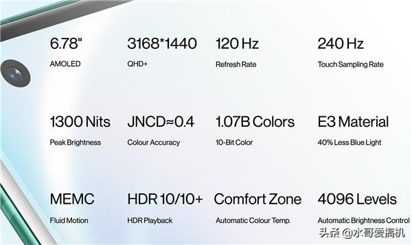 不过有一说一一加8Pro的这个蓝色绿色?挺好看的,质感看上去也不错,屏幕尺寸OPPO是6.7寸,一加是6.78寸,我如果没猜错的话这是就是一块屏幕,因为我看了下参数也都一样,分辨率、刷新率、采样率、10.7亿色、JNCD 0.4,都支持HDR10认证,但是峰值亮度一加要高100达到了1300nits!