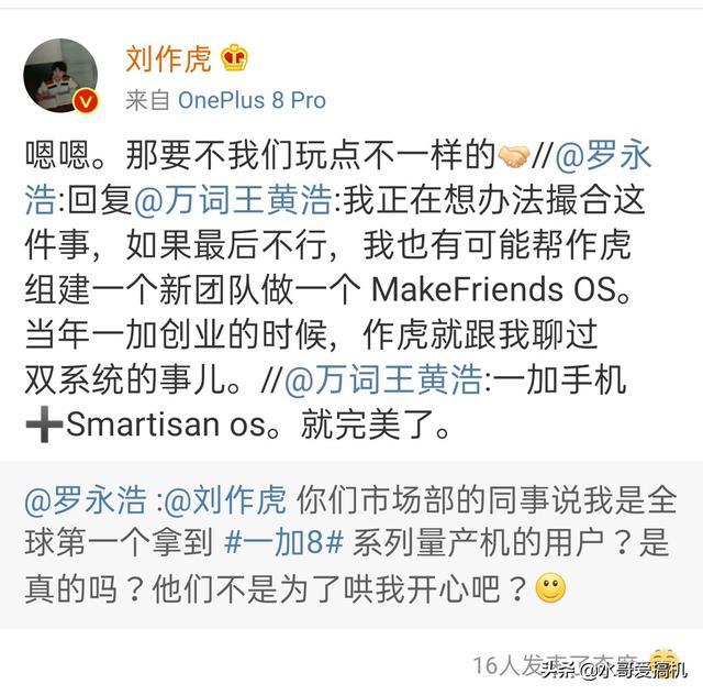 最近刘作虎自己也表明了要和罗永浩合作新系统的问题,我觉得如果这两人能够碰撞出火花也是可以的,其实看来一加手机国内系统UI革新是板上钉钉的事实了,到时候就看是和罗永浩合作出新系统,还是一加延续OPPO的ColorOS系统呢!