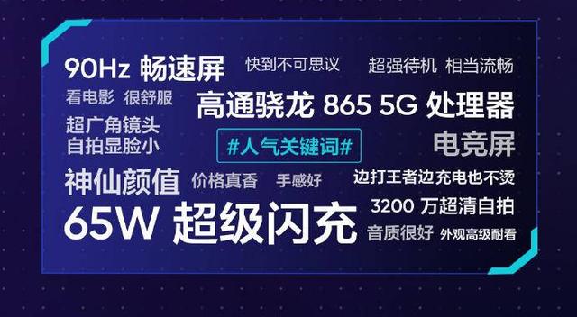 能够在新老厂商的多款机型中脱颖而出,自然源于真我X50 Pro的强悍实力。在用户关注度最高的关键词中,65W超级闪充、骁龙865 5G处理器、90Hz畅速屏、神仙颜值、3200万超广角自拍成为出现最高的关键词,另外“价格真香”也是真我X50 Pro受到青睐的原因之一。