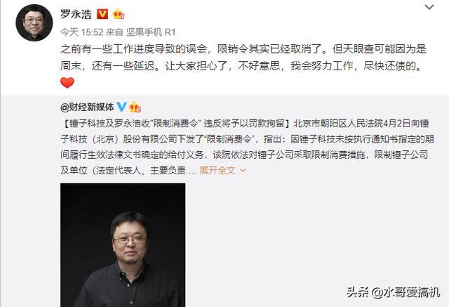 不过老罗已经进行正面回应了,说限制其实已经取消了,可能是由于周末原因信息有一些延迟,最后这句话看上去有些诚意我会努力工作,尽快还债的,不过我觉得老罗可以把锤子科技申请破产基本上就没啥债务了,个人欠的应该也会很快还完?