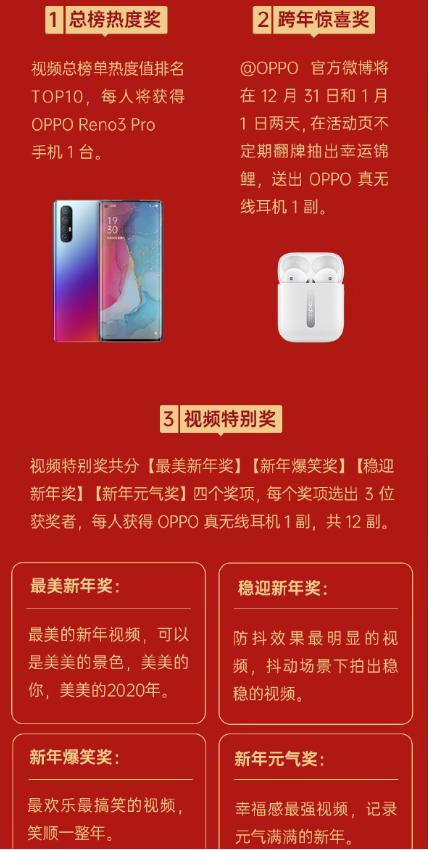 既然是活动,自然也少不了奖品,OPPO共拿出10部Reno3 Pro奖给总榜热度TOP10的网友,还有真无线耳机作为跨年惊喜奖。另外还分设“新年爆笑奖”、“稳赢新年奖”“最美新年奖”、“新年元气奖”四个奖项,每个奖项3名获奖者,各得OPPO真无线耳机一副。