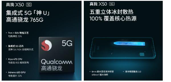 除此之外,realme真我X50搭载高通骁龙765G新“神U”,得益于7nm+EUV先进工艺,骁龙765G在CPU和GPU性能大幅提升的同时,功耗下降了35%,不仅会释放发热对性能的制约,还可以有效增加续航;另外,realme真我X50在此基础上搭载了五重立体冰封散热系统,可100%覆盖核心热源,进一步提升了手机的性能和续航体验。