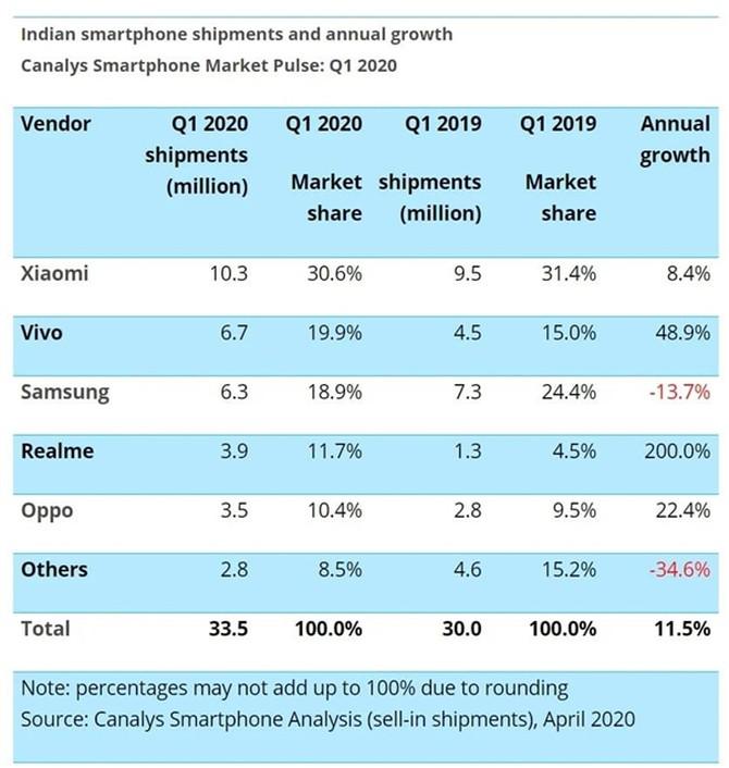 在国内手机市场,除了苹果,份额几乎都被国产手机占据了,三星的份额显得很惨淡。然而在13亿人口的印度,三星同样遭受了不小的冲击,同样很难抵挡国产品牌的崛起。根据Canalys发布的2020年一季度报告,三星只能排在第三。