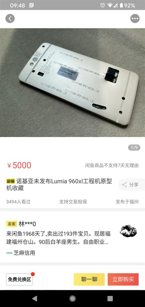 还有多少人记得微软的Lumia系列?作为微软手机的最后绝唱,Lumia 950系列是最后的一款产品,不过,下一代Lumia 960 XL其实已经制作出了工程机,但是直到该系列宣布停止开发都没有正式上市,对于喜欢Lumia系列的用户来说不得不说是一个遗憾。近日,有人在闲鱼上上架了一台Lumia 960 XL的工程机,并且要价5000,引起了许多人的围观。