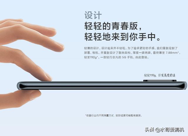 小米10青春版主打的卖点,5G、轻薄7.88毫米搭配192g、外观配色时尚年轻蓝莓薄荷、白桃乌龙、黑巧风暴、四季春奶茶、桃子西柚,咋一看以为小米转行卖奶茶了呢?