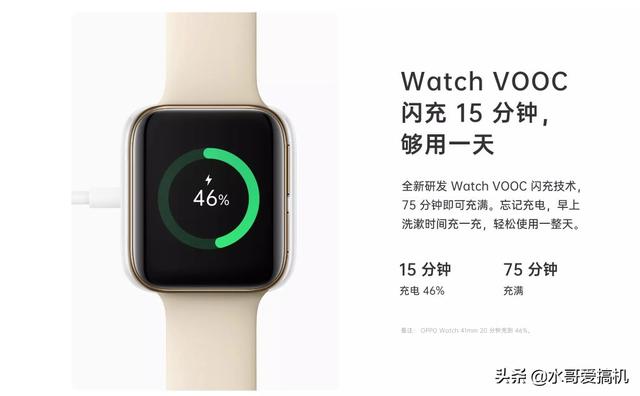 续航时间长,充电也不慢,OPPO把手机上的VOOC闪充技术下放到了手表上,Watch VOOC只需要15分钟就能充电46%了,完全充满虽然超过了一个小时但75分钟的成绩也足以吊打其它一票智能手表了,我个人绝对如果能够控制在1个小时以内就更好了!