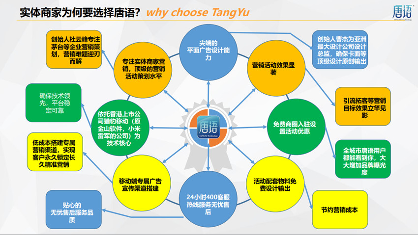 唐语科技是一家重研发,重品牌,重客户的企业,有着极好的社会公信力和市场声誉的企业,作为原生型应用软件技术开发提供商,为合作商家与其消费者之间搭建了一条专属的移动互联 网广告宣传通道,极大的降低了日常促销成本,实现了真正意义上的客户精准广告投放目标,开创了国内崭新 的立体化商业格局。这才是唐语科技的使命。