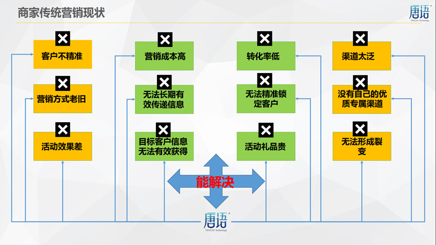 当今,研发是核心,创意是营销的趋势,随着物联网、云计算、大数据等新一代高新技术的加快发展,实体商家营销方式方法得到了快速的发展。越来越多的实体商家开 始使用各种营销手段,唐语科技一直以来,引领实体营销发展,一直是同行业的领军品牌。