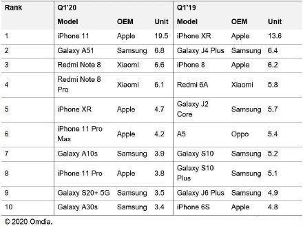 根据Omdia的最新调研报告,iPhone11是今年一季度最畅销的智能手机,单季度出货量高达1950万,拿下全球销冠的宝座。在榜单前十里,只有红米Note8、红米Note8 Pro分别拿下第三、第四名,其它就只剩下三星低端机,就是iPhone11 Pro。至于风头正猛的华为手机,却榜上无名。