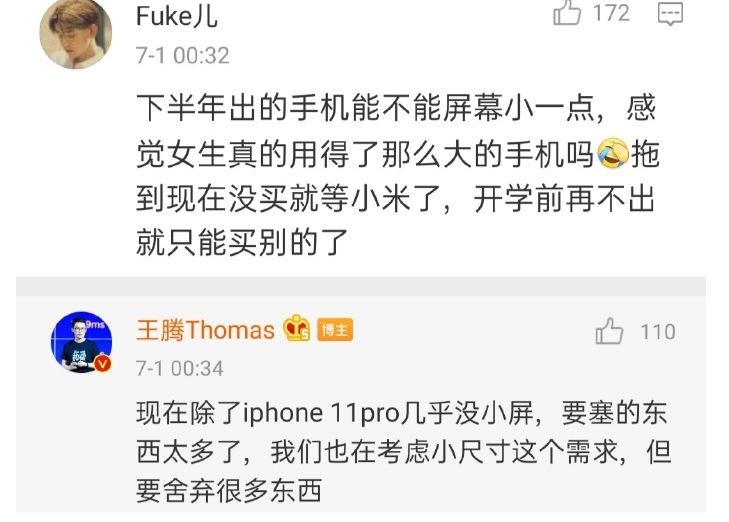 早在3月份就曝光小米内部有一款小屏手机正在打造,之后在愚人节小米高管王腾又借机放出了小米6经典重制版,就是主打小屏+高配。之后关于小米小屏新机的传闻不绝于耳。有趣的是,就在今天荣耀推出了超大屏7.09寸的荣耀X10 Max之后,王腾再次回应