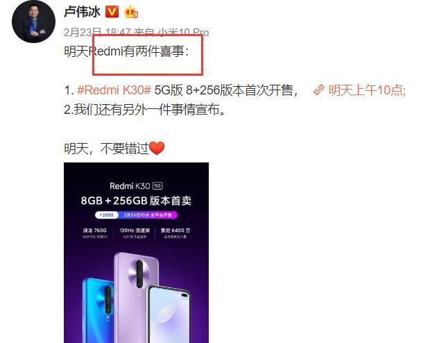 其实,早在昨天下午18点47分,卢伟冰就预告了今天要放出的消息,他直言Redmi将有两件喜事公布。
