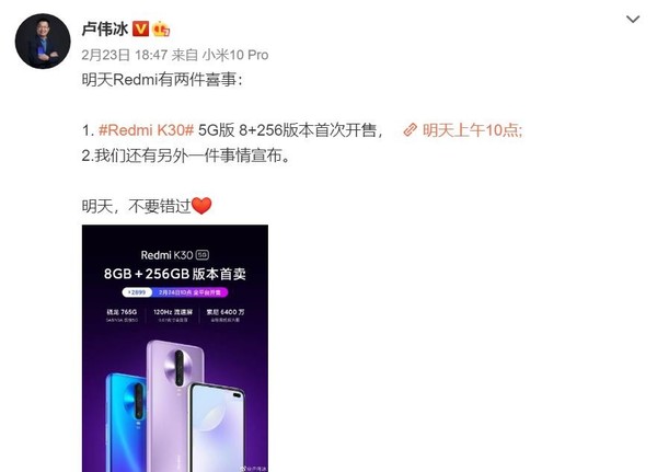 另外,2月23日晚,Redmi品牌总经理卢伟冰向网友透露,今天除了Redmi K30 5G 8GB+256GB版本首次开售外,还会有另外一件事情宣布。虽然卢伟冰并未说是什么事,但是广大网友还是猜了个八九不离十,应该是Redmi K30 Pro要官宣了。此前卢伟冰表示,Redmi K30 Pro的发布时间会卡在华为P40系列和荣耀30系列两个发布会之间,目前另外两场发布会并未官宣,如果今天Redmi K30 Pro官宣,大家也可以推测一下另外两场发布会的时间。