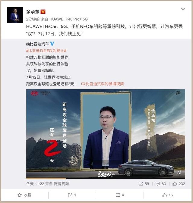 而在之后,华为余承东也是转发了这一微博并且透露道:比亚迪汉将首次搭载华为的HiCar以及NFC和5G技术,手机就能够作为车钥匙,让出行更加智慧。