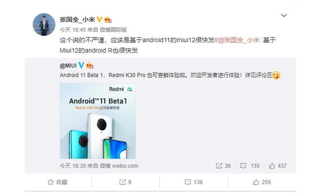 起初是小米MIUI官方发布消息称红米K30 Pro版本能够在第一时间进行全新的安卓11的Beta 1版本的尝鲜体验升级,于是乎就有网友开始催安卓11版本的MIUI 12,于是乎张国全就称基于安卓11所开发的小米MIUI 12版本即将发布。