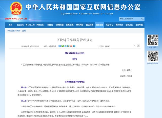 2019年1月,国家互联网信息办公室发布《区块链信息服务管理规定》,要求所有区块链信息服务提供者应当在提供服务之日起十个工作日内通过区块链信息服务备案管理系统填报备案信息。