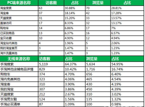 无线占比占比权重非常多,特别是手淘搜索5119在全部流量占比是65%以上(手淘搜索访客除以所有终端的访客数7934得出),这样,我们在无线端可以增加对有效关键词的数据采集及监控,增加关键词的精准优化,再次提高流量转化率的提升;其次在PC端流量来源入口比较少,虽然我们PC端的淘宝搜索和淘宝客也在合理的使用,可是流量的来源访客太少,必须加大投入了直通车推广,找到合适的关键词进行强推,而不是把PC端的来源忽略不计.