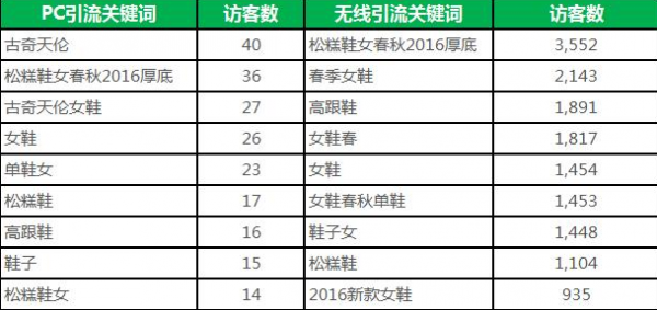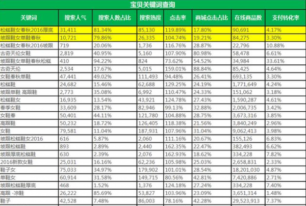 通过表格呈现的数据,我们可以“松糕鞋女春秋2016厚底”和“坡跟鞋女单鞋春秋”是竞争度匹配宝贝最好的关键词,在后期维护这个宝贝的时候,重点对这2个词精准营销.