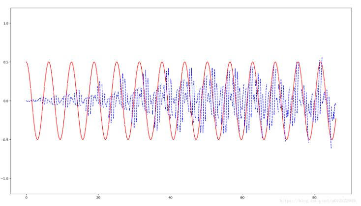 部分调用keras库代码如上图所示,用正弦波预测余弦波,出现如下现象:
