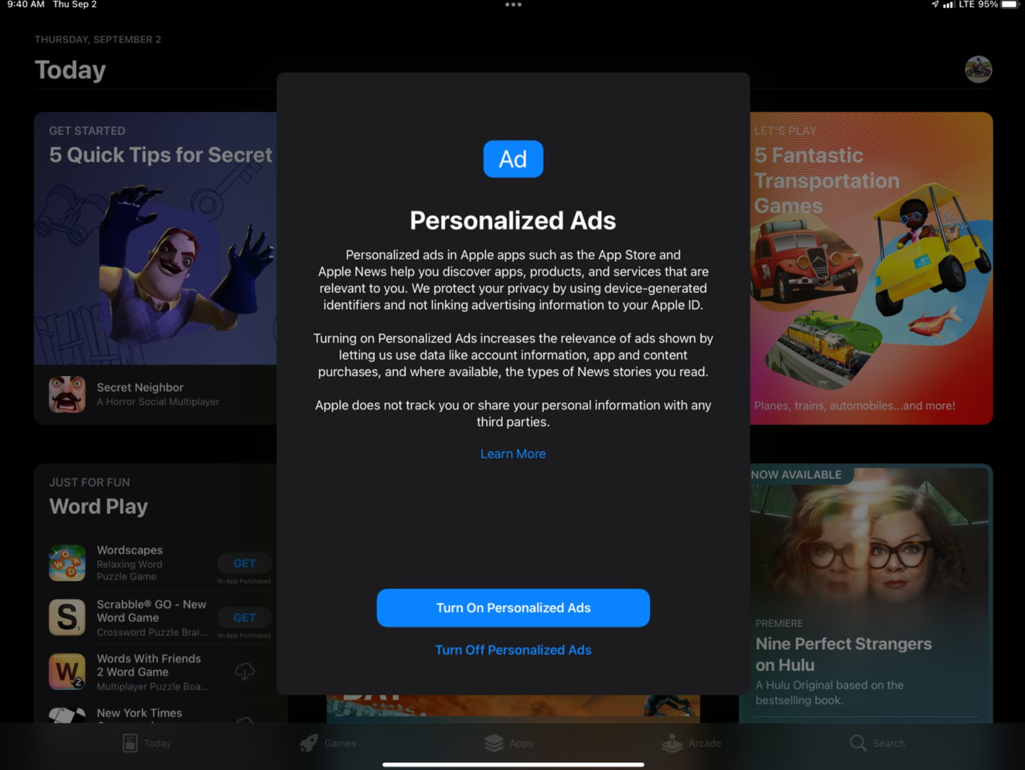 6 日消息 据外媒 9To5Mac 报道,苹果添加了一个提示,询问 iOS 15 用户是否要在第一方 App 中启用个性化广告。