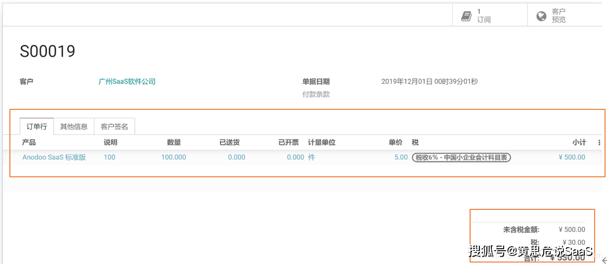 在实际销售的过程中,SaaS公司很多时候需按照销售订单的预付款开具发票。如下图,是一张销售总金额为500元+30元的销售订单,这种订单已经生效,且产生了一个100账号的SaaS订阅关系。