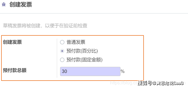 系统支持按照一定比例,或者固定金额为预付款开发票。比如预付整个合同款的30%,或者预付30万等等。如果某些项目按照合同里的某一个交付部分预付,如预付SaaS账号6个月的费用等,可参考创建交付产品的发票。