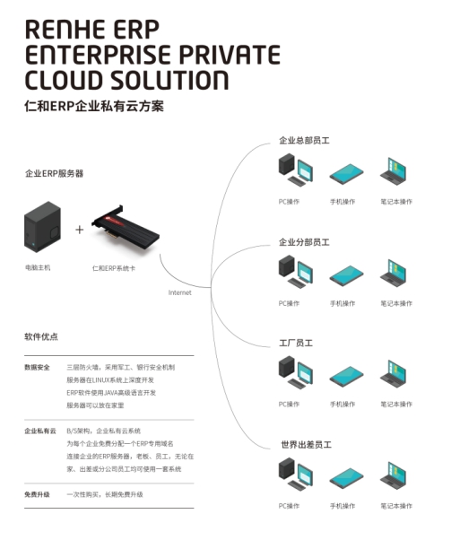 1、安装方式: 仁和ERP全球首创带硬件ERP系统卡,ERP 系统卡带128G内存,集成LINUX操作系统,免安装即插即用。
