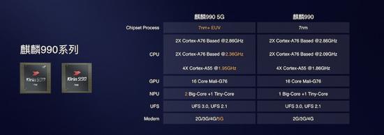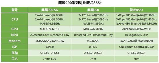除此之外,麒麟990系列同样支持最新的UFS 3.0存储,与骁龙855+相同。